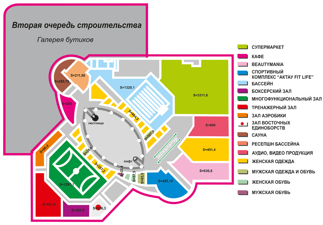 Кинотеатр «Chaplin», ледовый каток «Mega Ice», Fast food «General Food Aktau», Бильярд, боулинг «Assorti Aktau», детская зона «Oinatown», гипермаркет электроники «Sulpak», супермаркет «Атаба», парфюмерные магазины «Французский Дом BSB», «Beautymania», салон красоты «Инь-Ян» |